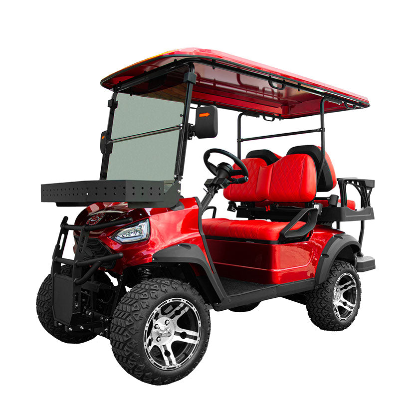 Experience eco-friendly golfing with our Electric Golf Cart featuring roof-top solar panels for extra solar-trickle charging. This four-seater unit offers a semi-enclosed design, complete with a radio, foldable front windshield, drink holders, and front storage. It's perfect for various weather conditions, and the 48V SLA battery can handle up to 300 charge cycles. Enjoy a luxurious and green golfing experience – when you golf, it's a smart choice to go electric.
