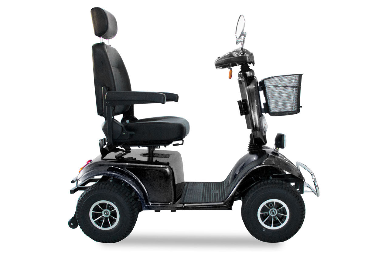 Pair text with an image to focus on your chosen product, collection, or blog post. AddThis stylish and robust 4-wheeled scooter offers both stability and maneuverability for indoor and outdoor use. It features a Deluxe Captain's style seat for comfort, can support up to 330lbs, and comes with various adjustable features like the seat, armrests, and headrest. The scooter also includes anti-tippers and a large carry basket. With rear-wheel drive and a compact size, it delivers excellent maneuverability and accessibility, performing well indoors and on smooth outdoor surfaces.